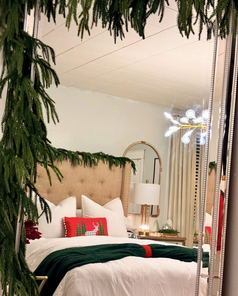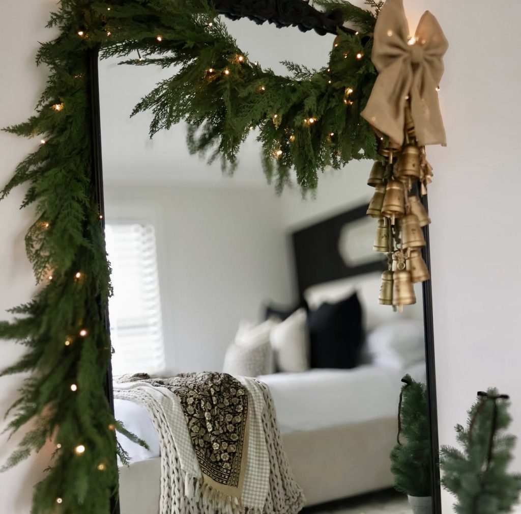 This room celebrates Christmas with golden bells and a beautifully draped garland over a mirror framed in black for contrast. String lights add a warm glow, while plush bedding invites relaxation. This sleek yet approachable design proves that small details—bells, bows, garlands—can have a big impact. It’s an ideal style for both modern and rustic farmhouse bedrooms and is easy to recreate with DIY projects.