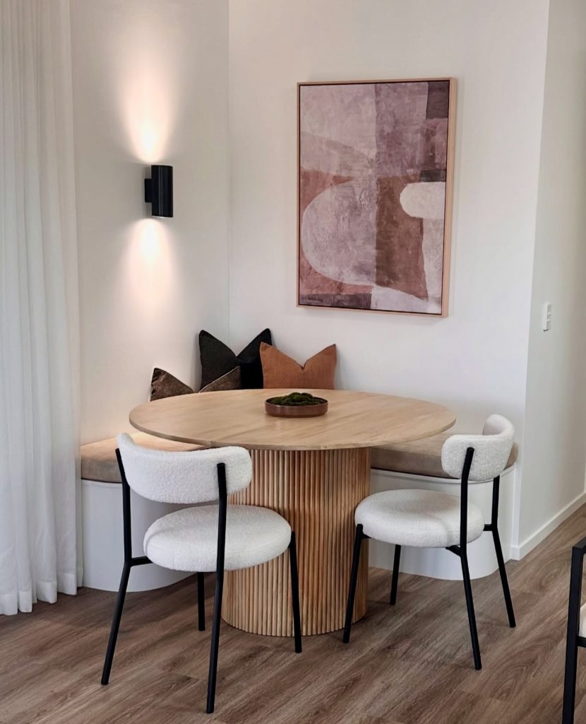 Ideal for limited spaces, a round dining table with minimalist chairs creates a snug and stylish nook. The ribbed pedestal base introduces tactile interest, proving that simplicity can still exude luxury. Neutral color schemes paired with layered cushions enhance comfort without crowding the area. Complementing the setup with tasteful wall art and a sleek wall sconce maintains a contemporary and artistic vibe, demonstrating that small-scale design can feel both open and inviting.