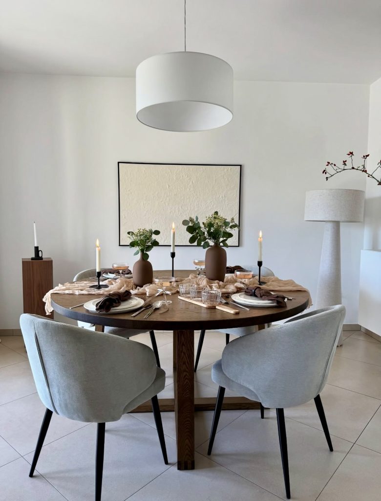 This round dining table serves as a harmonious focal point, perfect for contemporary interiors. The soft grey chairs with contrasting black legs add depth, while the wooden base of the table brings warmth to the setting. Accents like candles and greenery make it suitable for both casual meals and celebratory occasions. Its versatile design fits seamlessly into compact living rooms or open-plan spaces, embodying a timeless blend of style and practicality.