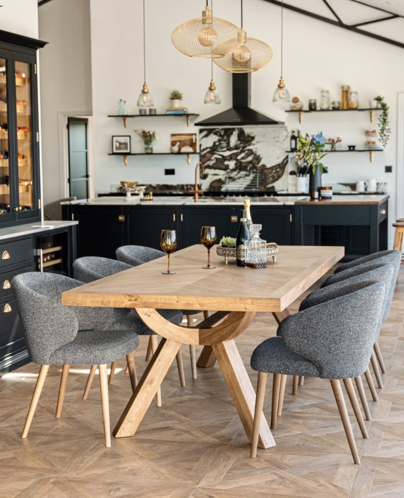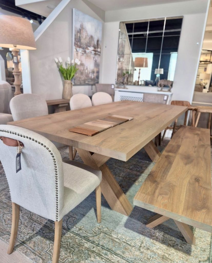 This striking wooden dining table features sawed legs that combine artisanal woodworking with bold design. The geometric base adds architectural interest, while soft-textured chairs provide inviting contrast. Perfect for kitchens or dining rooms aiming to make a statement, this style blends modern luxury with casual charm. Earthy tones and wood finishes allow it to integrate seamlessly into open layouts or patio-adjacent spaces.
