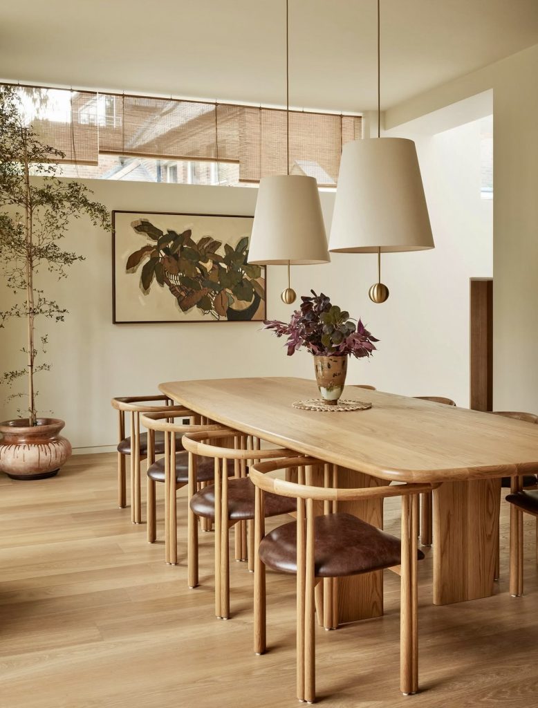 Embodying minimalist elegance, this wooden dining set with matching chairs reflects the essence of Scandinavian design. Clean lines and natural hues are complemented by oversized pendant lighting, making it suitable for both casual family meals and formal dinners. The six-seat configuration is perfect for hosting, while the addition of greenery and ceramic decor creates a serene and effortlessly chic ambiance. This style remains a timeless favorite for those seeking understated luxury.