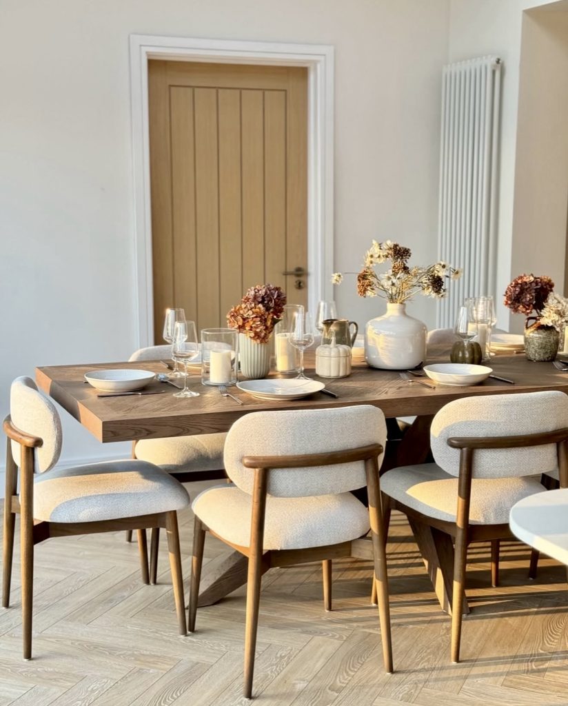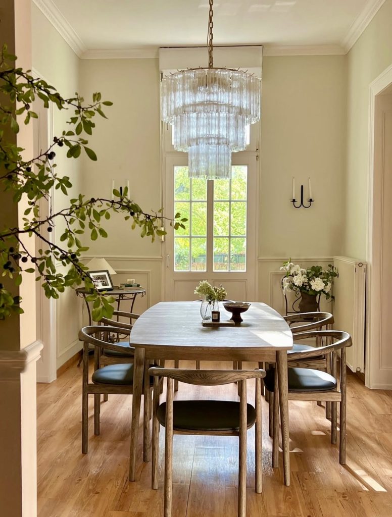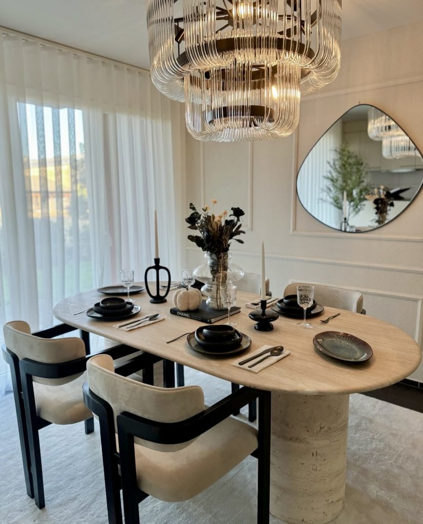 This sophisticated dining area features a sleek rectangular wooden table paired with cream upholstered chairs and a dazzling chandelier overhead. The dark table base subtly references the trend of black accents in interiors, while a layered rug adds texture and depth. Designed for six, this setup thrives in open-concept homes where elegance meets comfort without sacrificing warmth.