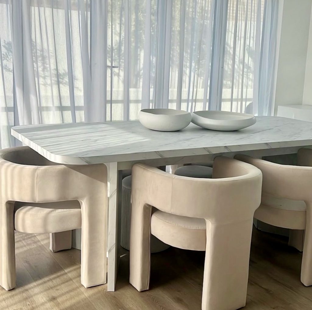 This sleek dining setup highlights the elegance of white marble paired with sculptural, curved chairs for a futuristic yet timeless look. The clean lines and muted tones allow the furniture to take center stage. Minimal styling with just a couple of bowls emphasizes the design’s simplicity. Bathed in soft daylight, this arrangement is perfect for open-plan homes where form and function blend effortlessly.