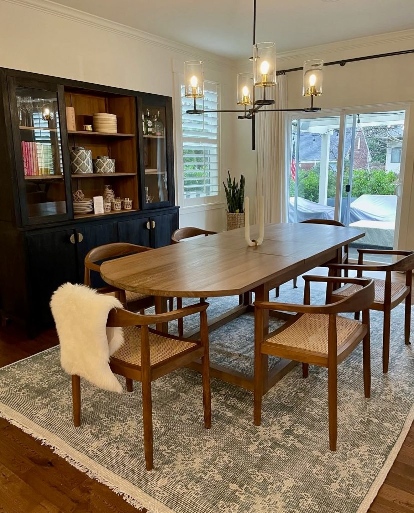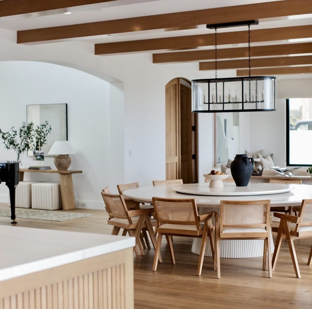 Combining coastal relaxation with modern wood finishes, this large round table is perfect for family gatherings and social brunches. Wooden chairs with woven backs showcase artisanal craftsmanship, while a bold black pendant light adds dramatic contrast. A rug beneath the table enhances coziness, making this six-seater ideal for farmhouse or California-inspired interiors. This design confirms the resurgence of large round dining tables as communal focal points.