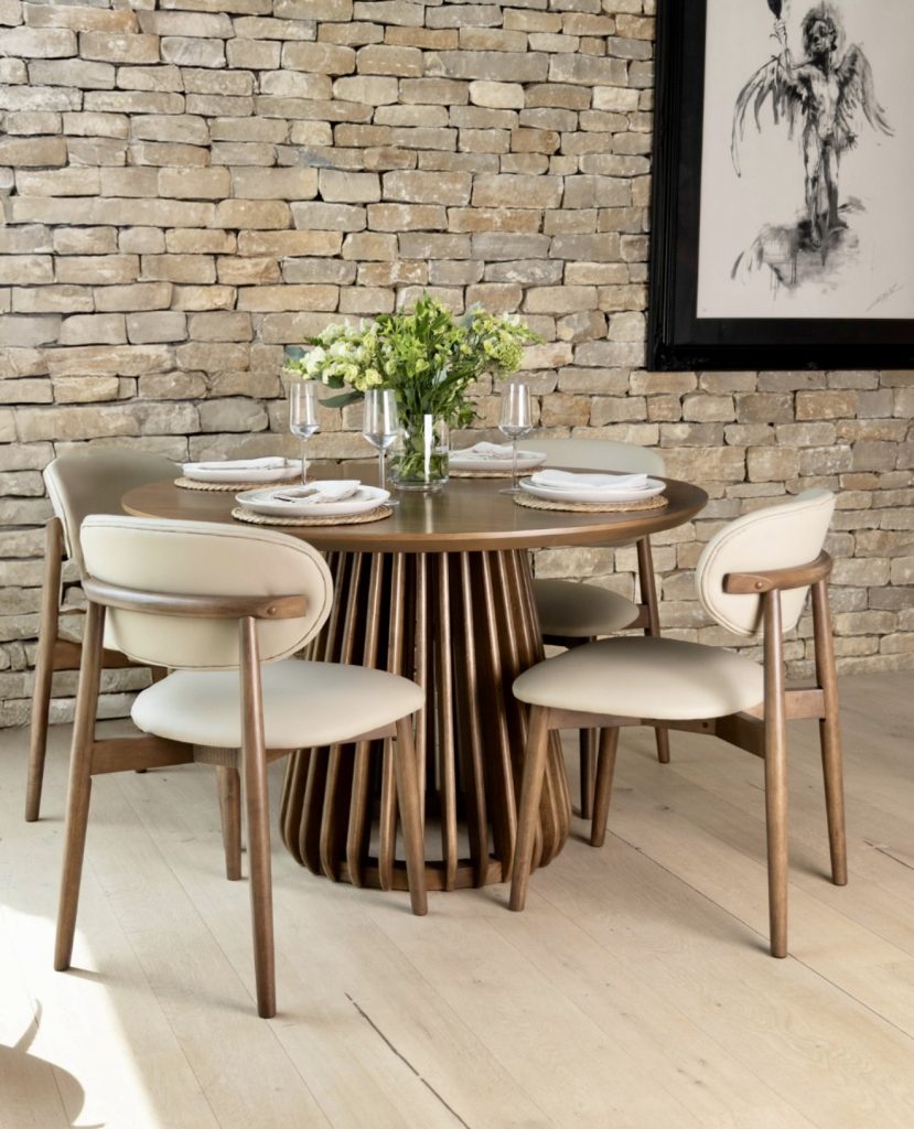 Featuring a sculptural wooden base, this round dining table becomes the room’s centerpiece, blending warmth with minimalist design. Cream leather chairs add sleekness, while the stone wall backdrop introduces natural texture and contrast. Ideal for small living rooms or kitchen nooks, the addition of glassware and greenery keeps the space fresh and elegant, proving that simplicity can be luxurious.
