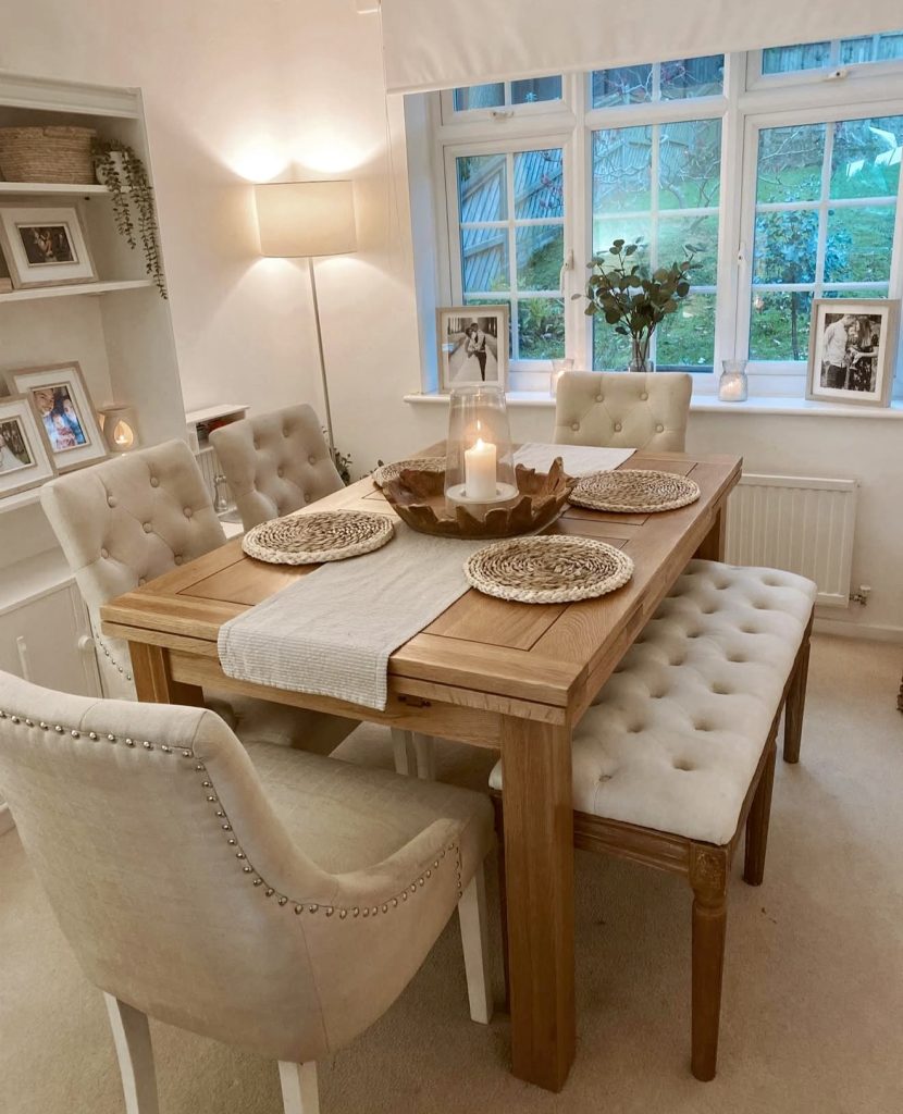 A wooden dining table combined with soft, white upholstered chairs creates a welcoming atmosphere that blends classic charm with modern flair. Designed to comfortably seat six, this arrangement suits larger families or those who enjoy hosting festive dinners. Sunlight accentuates the wood’s natural grain, adding an organic warmth to the space. Minimalist accents like ceramic pieces and dried floral arrangements keep the aesthetic refined yet inviting, illustrating how understated elegance can enhance everyday dining experiences.
