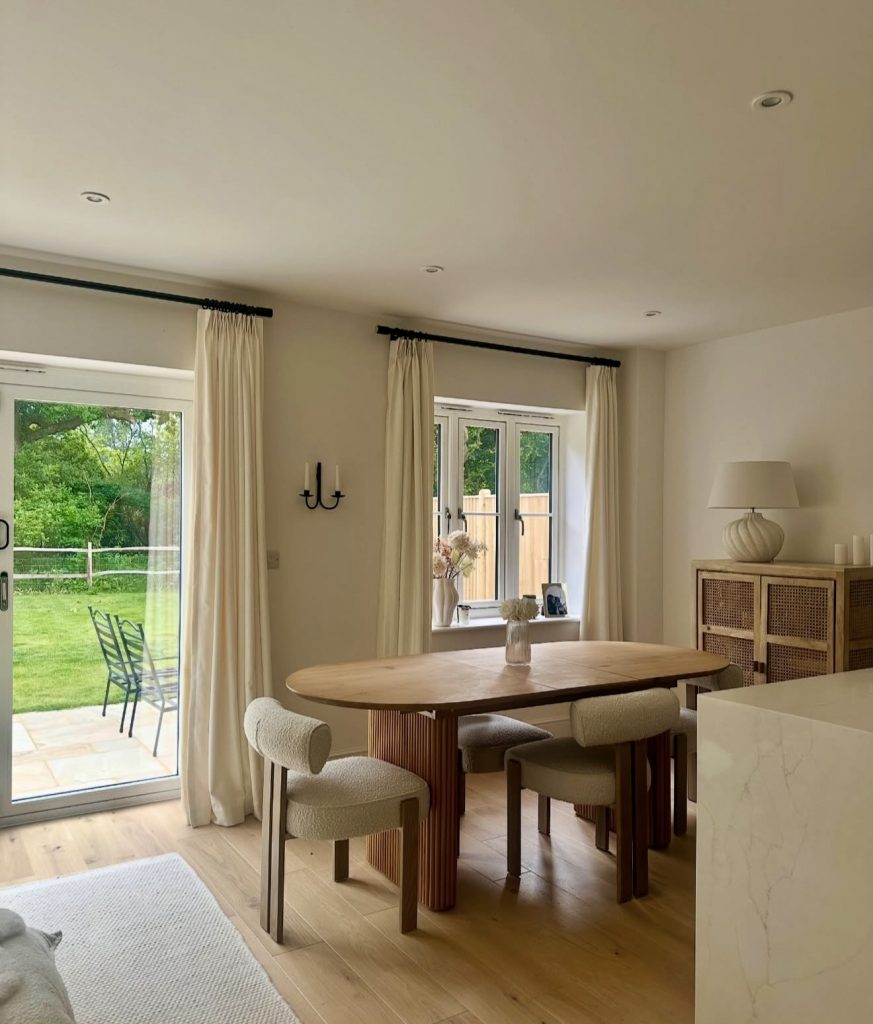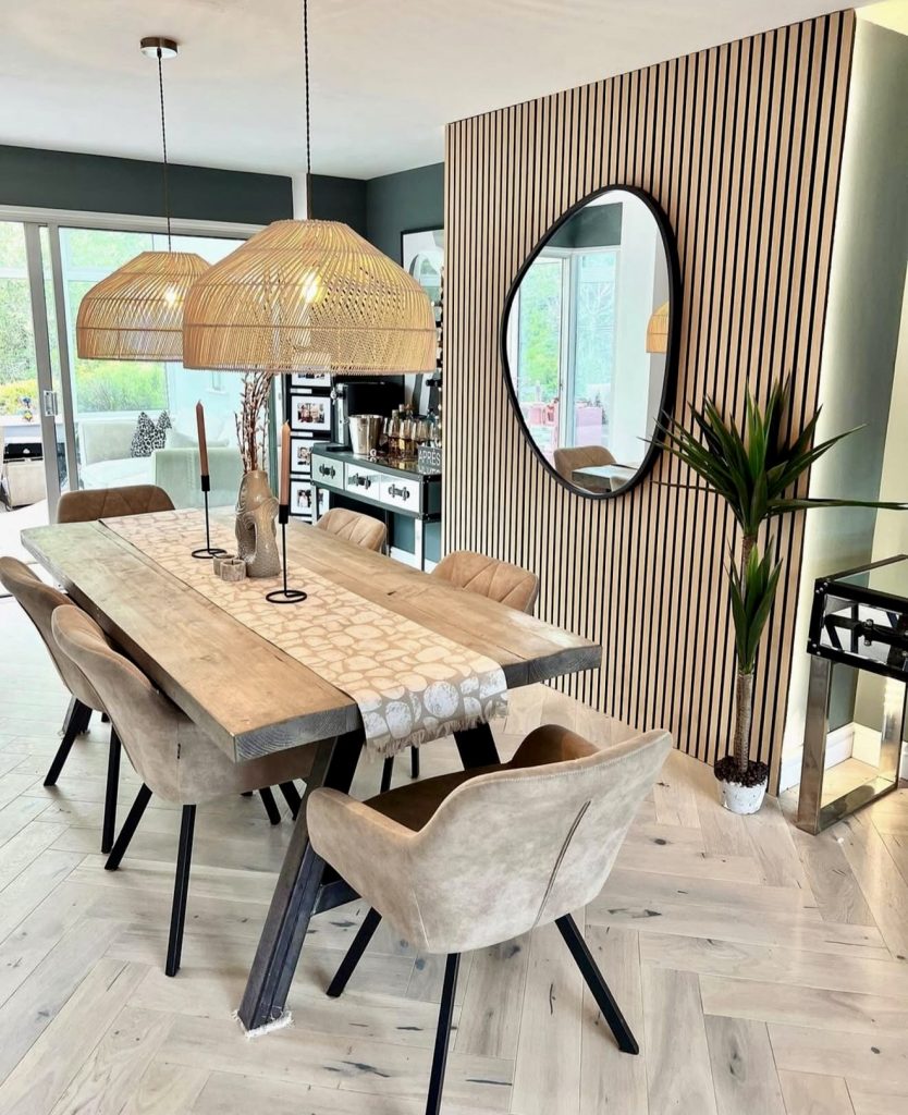 For enthusiasts of bold lighting and contrasting textures, this industrial-inspired dining room features a raw wooden tabletop supported by sleek black legs. Suede chairs complement the natural tones, while large rattan pendants cast a warm glow. Coordinated wall paneling adds rhythm and sophistication, making this six-seater perfect for open-plan living. Subtle touches like mirrors and plants balance the space with warmth and depth.