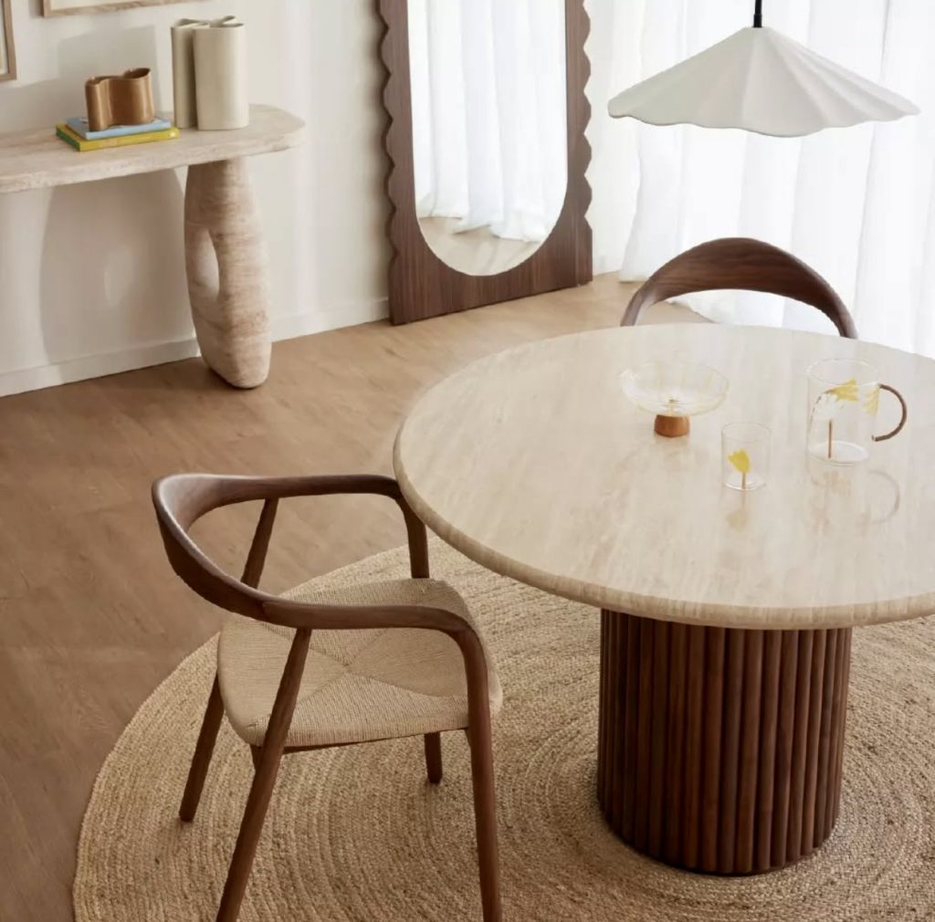 This round travertine dining table showcases understated elegance through its textured surface and ribbed wooden base. Curved chairs and a woven rug soften the overall look, making it ideal for small kitchens or compact dining areas. The muted color palette pairs effortlessly with glass accents and natural fibers, reflecting the tactile minimalism favored in contemporary design circles.