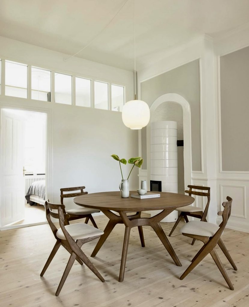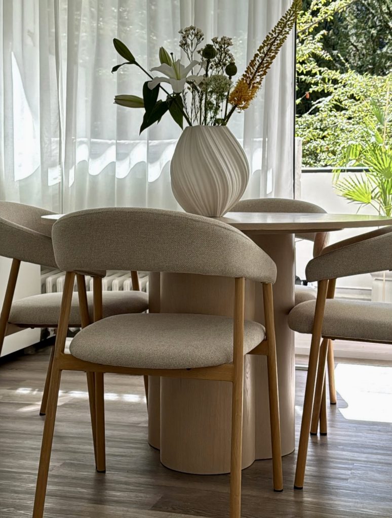 Bringing a fresh vibe to small spaces, this round table with soft wood tones and pale upholstery is bathed in natural light filtered through sheer curtains. A sculptural vase centerpiece adds artistic flair, proving that simplicity and elegance are timeless. This design is especially appealing to fans of Scandinavian minimalism, offering a charming and functional dining solution.