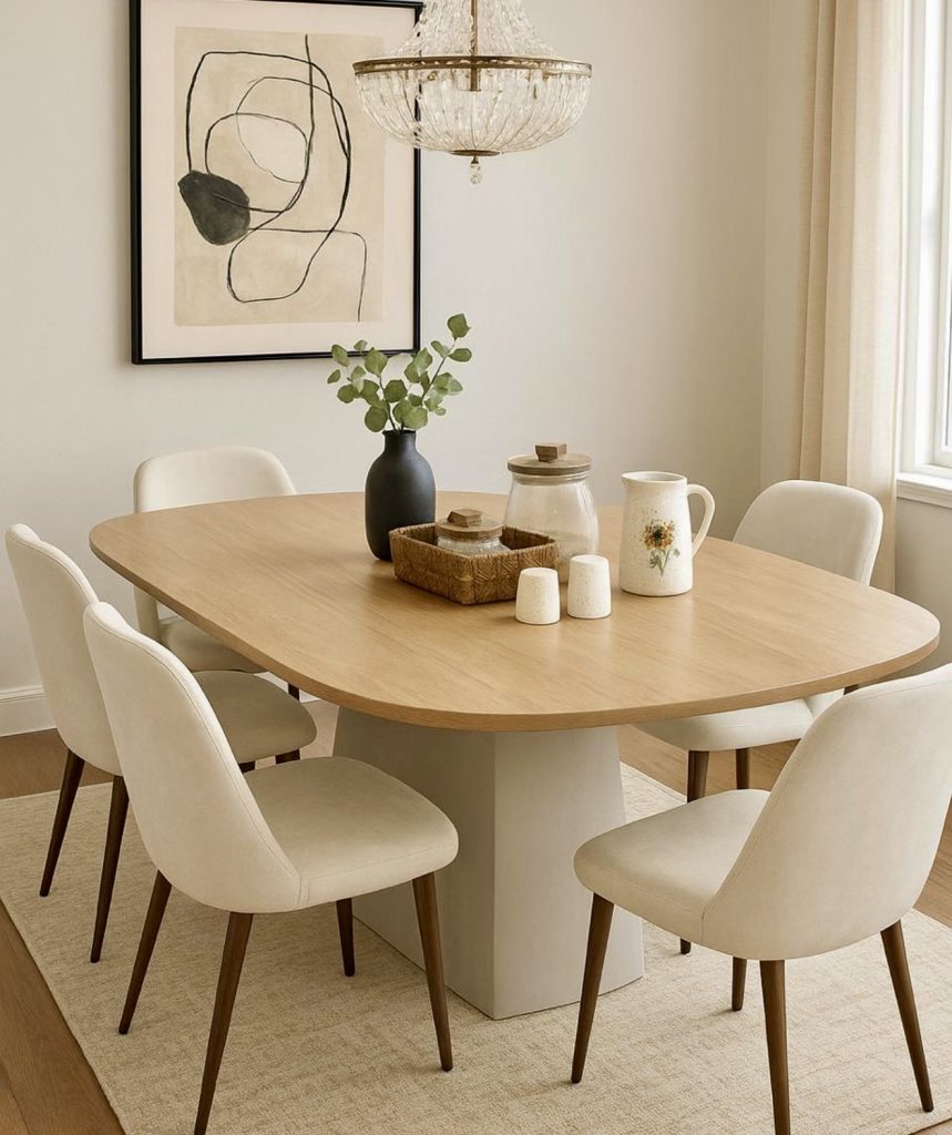Featuring smooth contours and natural textures, this warm dining setup includes an oval wooden tabletop resting on a softly colored pedestal base, paired with cream chairs. The neutral palette enhances the airy feel, making it suitable for both everyday meals and special occasions. This design perfectly captures the essence of modern luxury wood style, ideal for apartments and suburban homes alike.