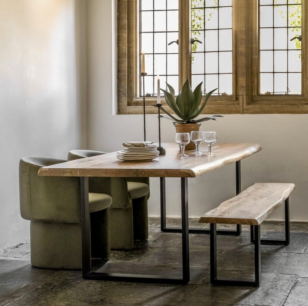 A favorite among interior designers, this industrial-style wooden table features a live edge and robust black metal legs. The accompanying bench offers flexible seating, ideal for compact spaces, while sculptural chairs and greenery add warmth and texture. This design merges urban grit with natural comfort, making it perfect for lofts, RV-inspired interiors, or small apartments seeking stylish yet uncluttered dining solutions.