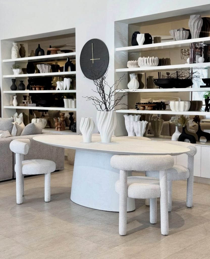 This all-white dining area evokes the ambiance of an art gallery, featuring an oval wooden table with a smooth matte base paired with plush boucle chairs. Organic ceramics and minimalist shelving complete the look, demonstrating how a neutral palette can create a high-end yet calming environment. Ideal for small rooms or minimalist homes, this design seamlessly integrates art, architecture, and function.