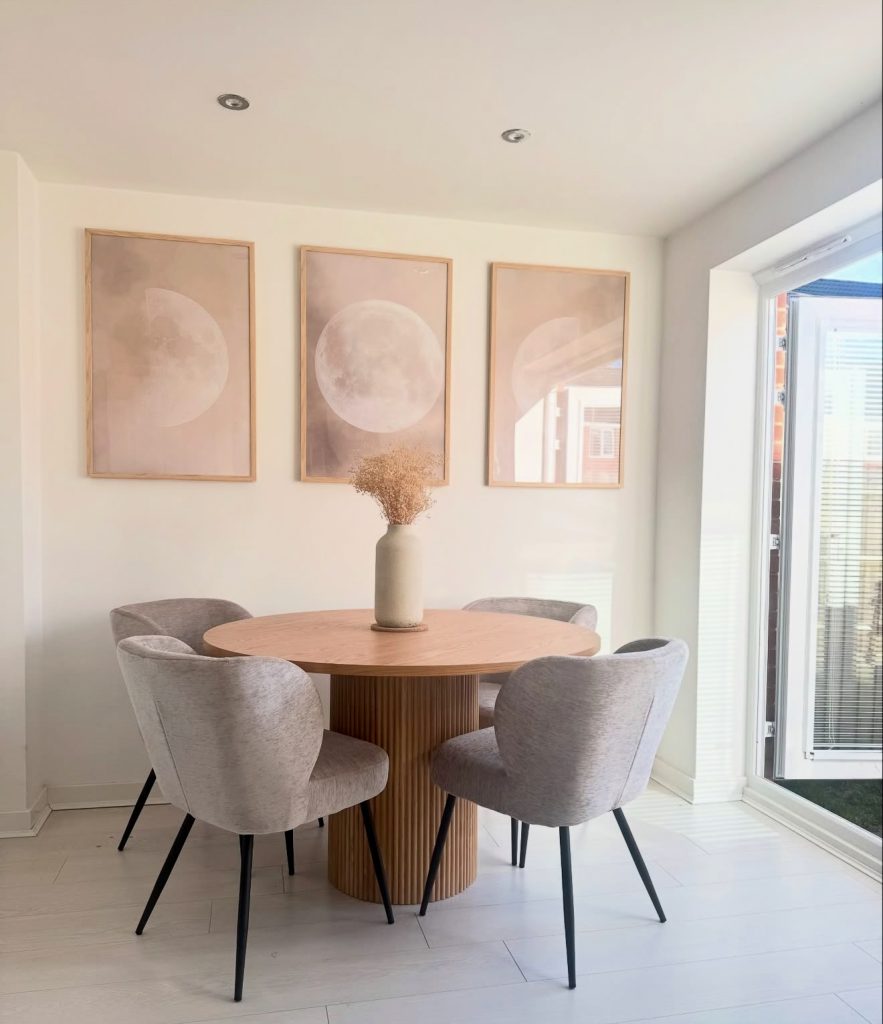 Creating a serene atmosphere, this round dining table with a ribbed wooden base is complemented by moon-phase wall art, adding a celestial touch. Light upholstered chairs and abundant natural light enhance the tranquil vibe, making it an excellent choice for apartments or condos. This design offers a compact, character-filled dining solution for creative homeowners.