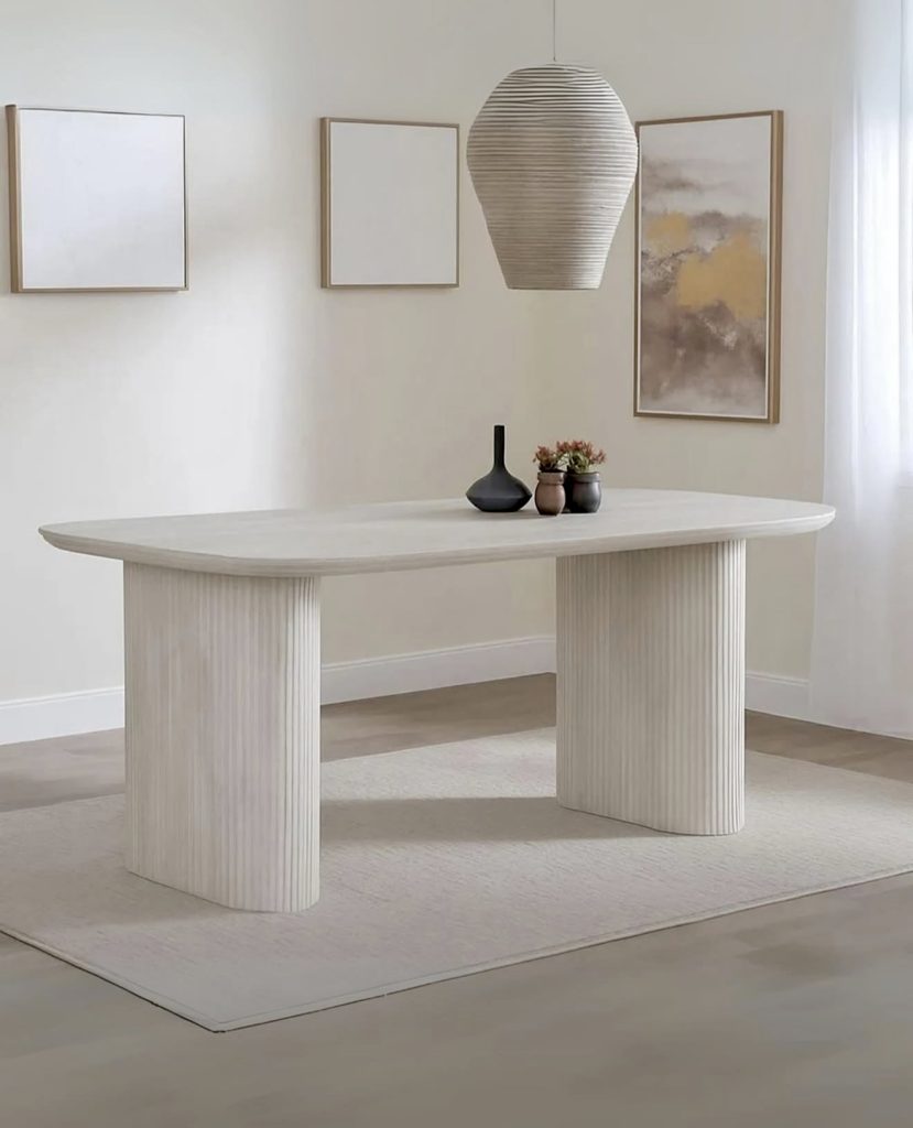Featuring a sculptural fluted base and curved rectangular top, this modern dining table brings architectural elegance to any space. The monochrome palette and clean lines make it a standout piece for minimalist interiors. It pairs beautifully with light wood flooring, a rug, and matte ceramics, making it ideal for kitchens or small living rooms seeking refined luxury.