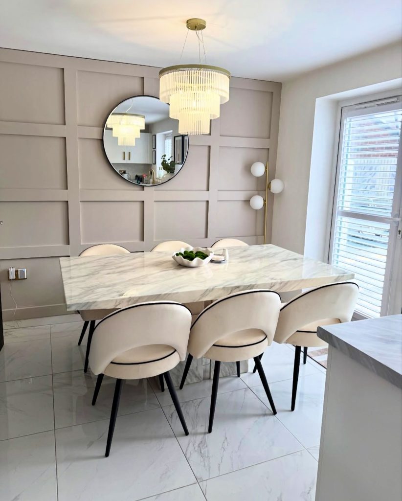 This marble dining table exudes elegance with its polished white surface and reflective finishes. Cream velvet chairs complement the sleek glass chandelier overhead, while paneled walls add a contemporary edge. Suitable for both intimate dinners and casual mornings, this design balances opulence with everyday practicality, making it a standout in modern dining inspirations.