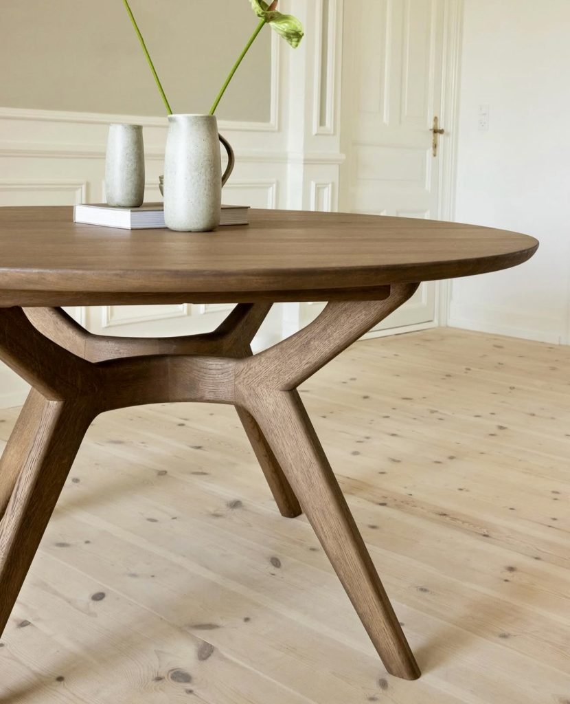 Reflecting mid-century modern influences, this round wooden table features geometric legs and fine craftsmanship. The intersecting base design serves as a conversation starter, while natural oak tones complement soft neutral surroundings. Minimalist decor keeps the focus on the table’s sculptural form, making it ideal for small spaces seeking timeless artistry.
