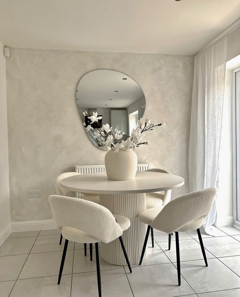 Designed for tight spaces, this round table with a ribbed pedestal base offers a cozy dining solution for small kitchens. Upholstered chairs in soft beige provide comfort without overwhelming the room. A large mirror reflects natural light, visually expanding the area and enhancing its welcoming feel. Simple greenery in a vase keeps the decor fresh and uncluttered, proving that even compact dining areas can be stylish and functional.
