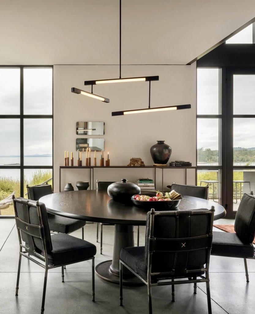 For those who appreciate striking design, this round black dining table offers a dramatic and sophisticated statement. Its sculptural base and matte finish exude modern appeal, complemented by contrasting chairs and minimalist lighting. Ideal for lofts or homes with panoramic views, this concept blends urban cool with intimate warmth, perfect for small spaces with big personality.