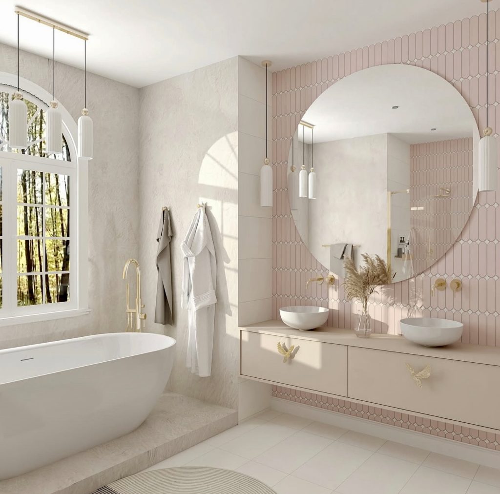 Handcrafted tiles with soft, uneven surfaces reflect light delicately, enhancing the blush walls. Paired with a floating vanity crafted from natural wood, this design strikes a calming balance between warmth and minimalism. Round pendant lights and brass fittings add sophistication, while pastel accessories and lush greenery can further enliven the space, making it ideal for both urban apartments and suburban homes.
