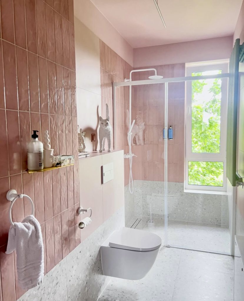 Combining dusky pink wall tiles with neutral terrazzo flooring, this design strikes a perfect balance between moody sophistication and practical urban living. The walk-in glass shower maintains openness, while whimsical ceramic accents soften the minimalist backdrop. This approach allows for easy updates through textiles or decor, making it a versatile choice for those who want a stylish yet functional bathroom that adapts to evolving tastes.