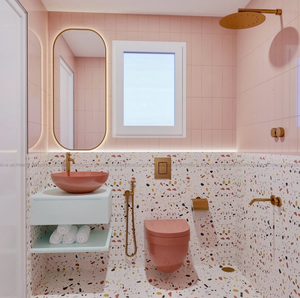 Pastel pink walls paired with terrazzo floors speckled in warm reds and ochres create a lively yet refined atmosphere. Matte-finished fixtures, including a coordinated sink and toilet, lend a contemporary edge. Thoughtful lighting around the mirror adds a gentle glow, while brass accents elevate the overall aesthetic. This design is ideal for those seeking a modern vanity style that balances trendiness with everyday practicality.