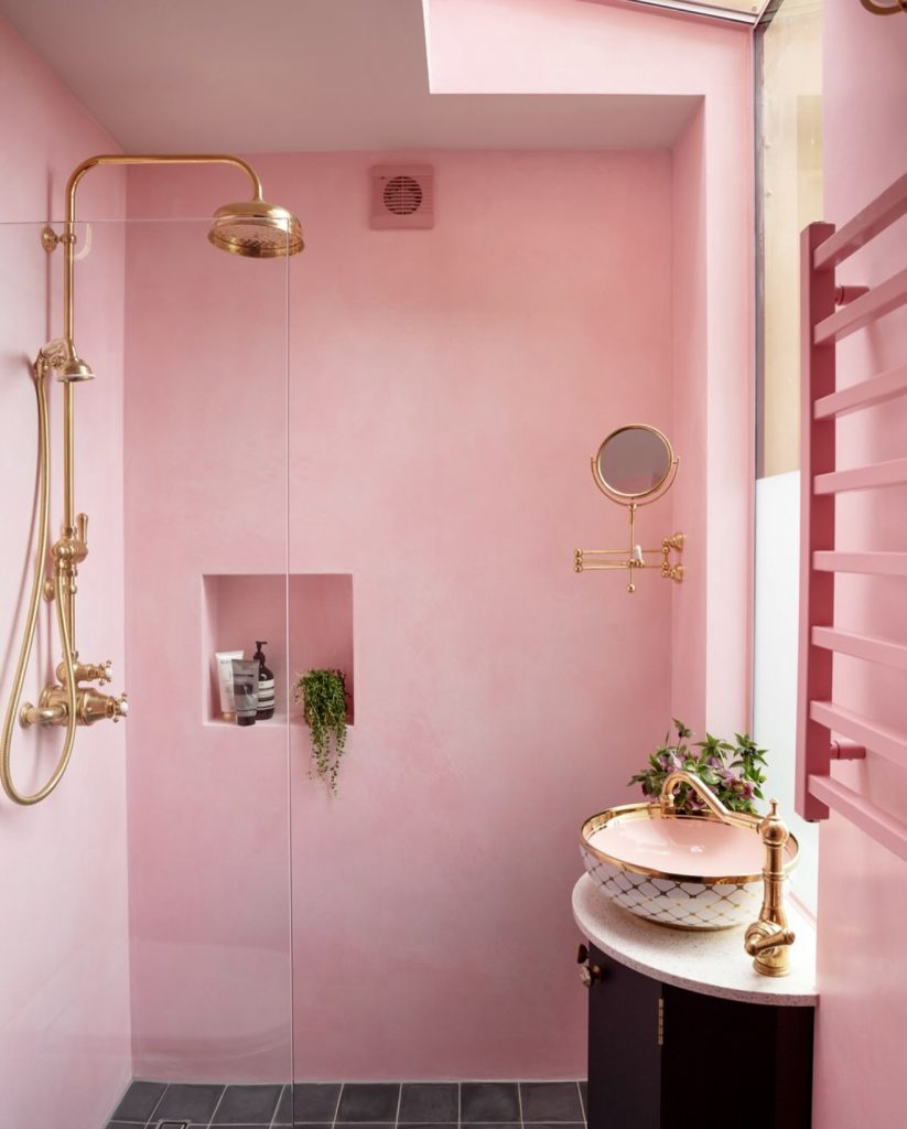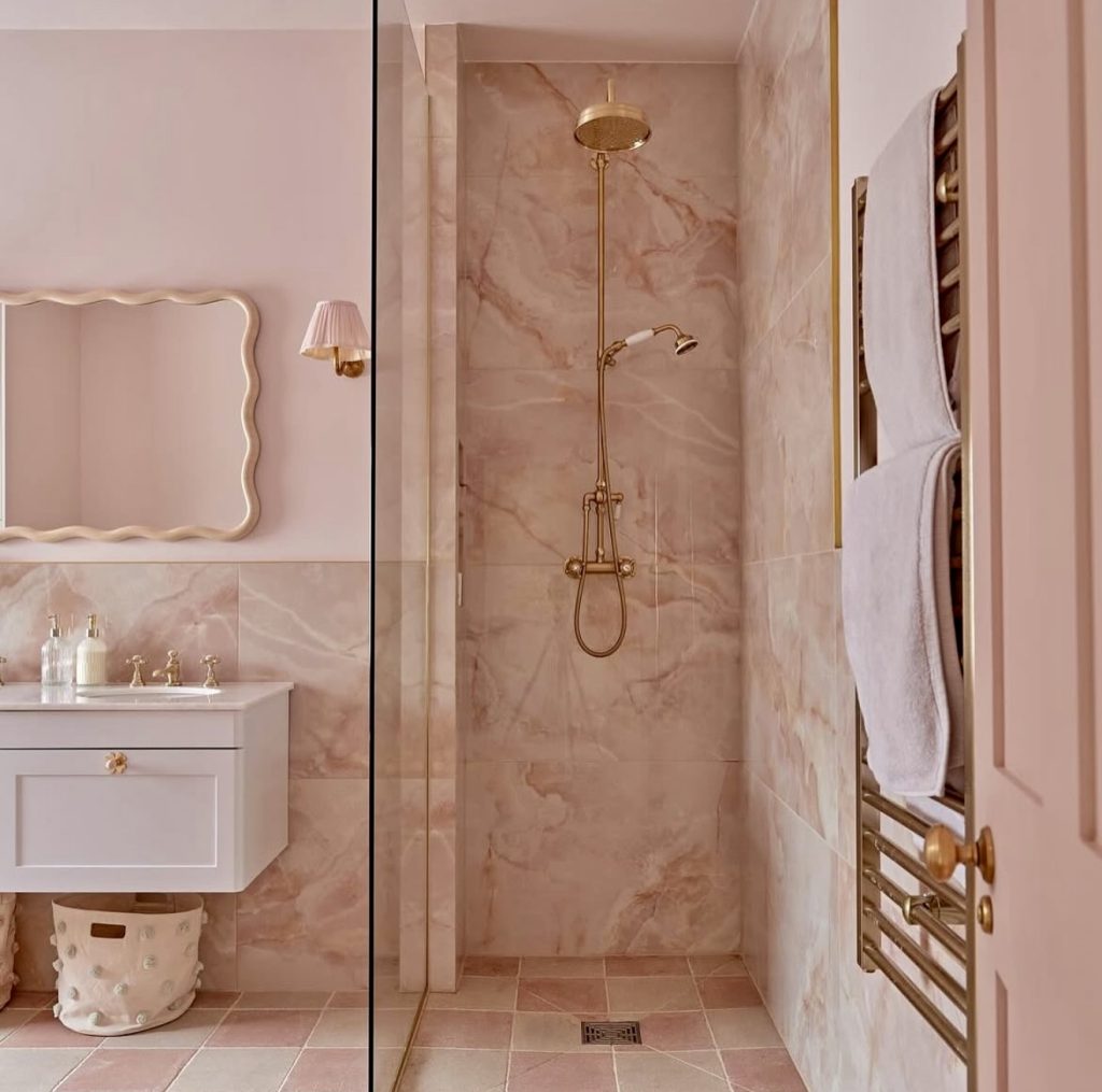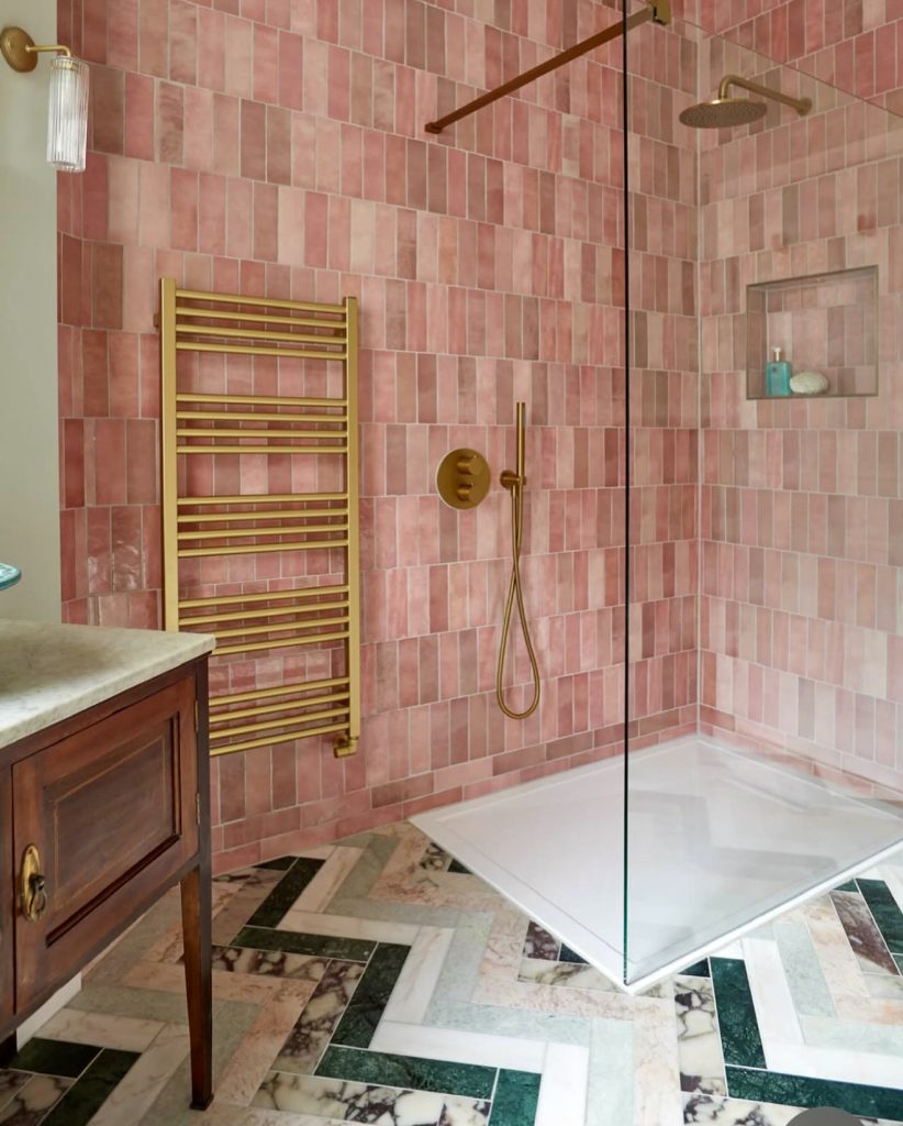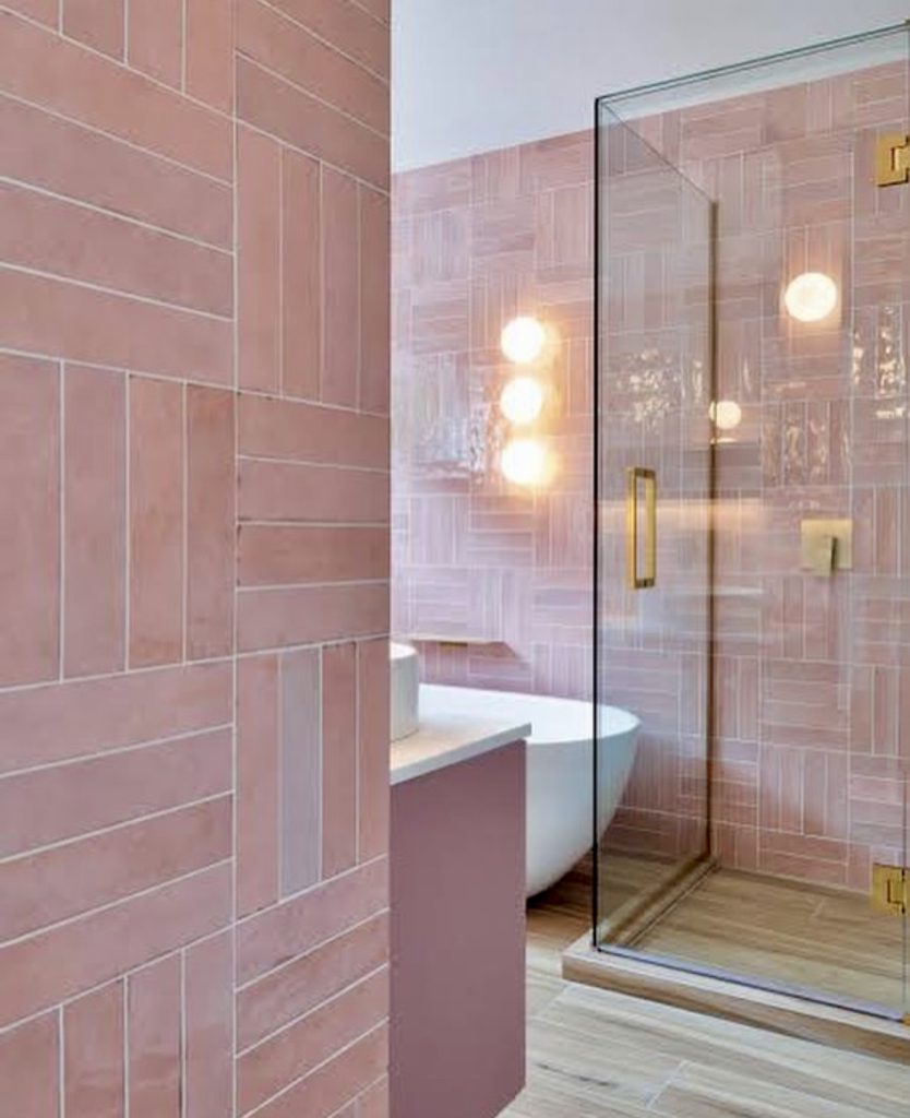 Pink subway tiles combined with golden brass fixtures create a classic yet inviting bathroom. A glass shower enclosure keeps the space open, while patterned flooring adds visual interest. This versatile design suits both traditional and contemporary homes, proving pink’s enduring appeal.