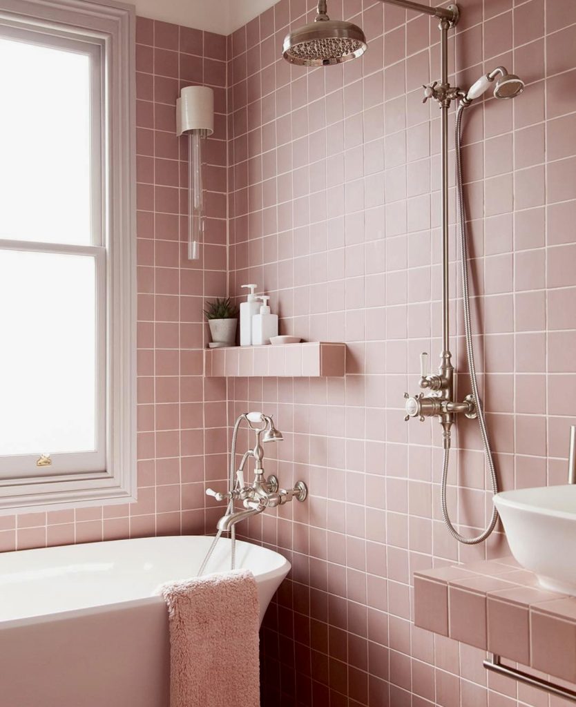 This design melds classic elegance with modern usability, featuring muted rose square tiles surrounding a sleek bathtub. Polished silver fixtures add a refined vintage touch, while simple accessories like plush towels and greenery soften the space. It’s a cozy yet stylish option for those who want a durable, timeless pink bathroom that feels both welcoming and subtly luxurious.