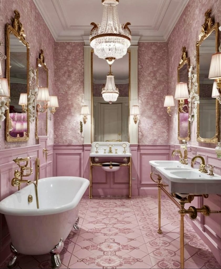 This lavish bathroom channels grand European elegance with ornate chandeliers, gilded mirrors, and intricate pink wallpaper. The detailed floor tiles echo the artistry of a bygone era, creating a space that’s both theatrical and functional. For those dreaming of a sultry, vintage-inspired sanctuary, this design proves that pink bathrooms can embody regal luxury.