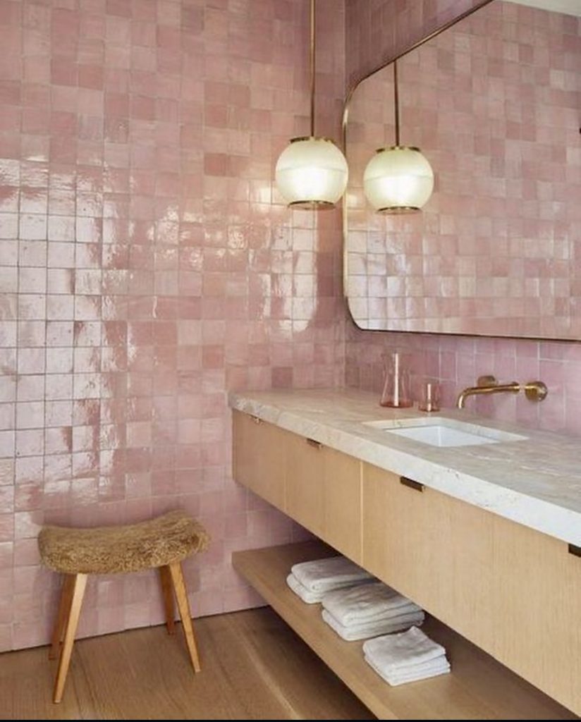 Glossy Blush Tiles with Dark Wood Vanity
