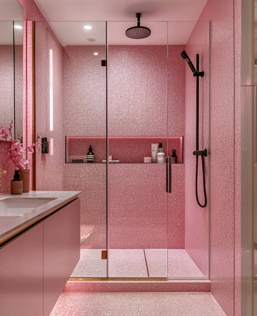 Featuring tiny mosaic tiles in vibrant pink shades, this bathroom exudes youthful energy and sleek urban style. The glass shower enclosure and matte black fixtures add a contemporary edge, while strategic lighting enhances the tiles’ reflective qualities, turning the shower into a radiant focal point. This design is perfect for compact spaces where a bold, playful atmosphere is desired. Consider complementing with cabinetry in coral or red tones for added vibrancy.