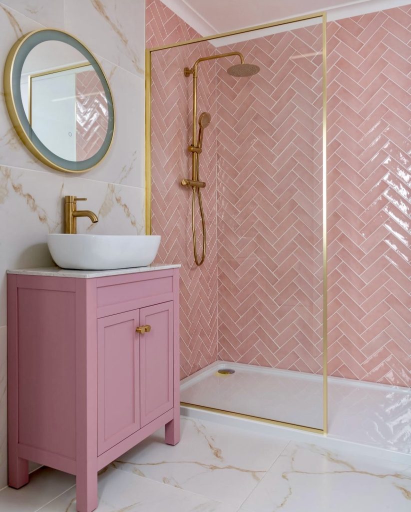 Glossy pink tiles arranged in a herringbone pattern create dynamic visual interest, while gold trim elevates the overall look. A coordinating pink vanity and a round mirror soften the geometric lines, blending glamour with approachability. Adding pastel towels or subtle accessories balances the richness, making this a chic yet livable bathroom design.