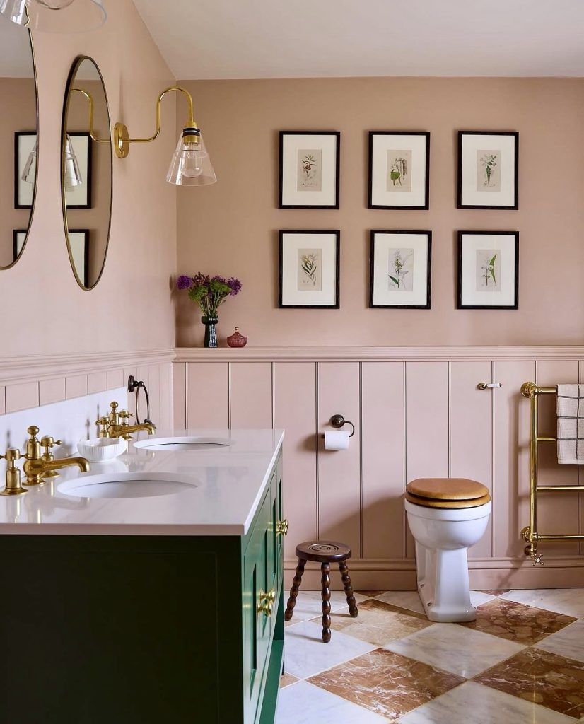 Soft dusty rose walls paired with paneled lower walls create texture, while a bold green and gold vanity offers striking contrast. Classic brown and white checkerboard flooring adds timeless appeal. Botanical prints enhance the vintage-modern fusion, making this design ideal for those who appreciate subtle tradition infused with contemporary flair.