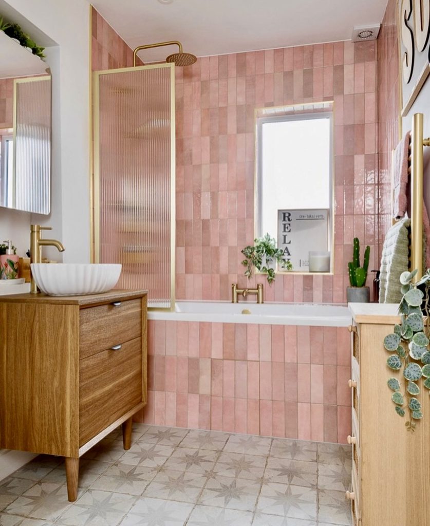 Vertical pink tiles set a retro tone, complemented by natural wood cabinetry and star-patterned flooring that injects personality. Brass fixtures add a touch of luxury, while green plants bring freshness and life. This layered approach proves pink bathrooms can be versatile, blending textures and colors to create inviting, character-rich spaces suitable for family homes.