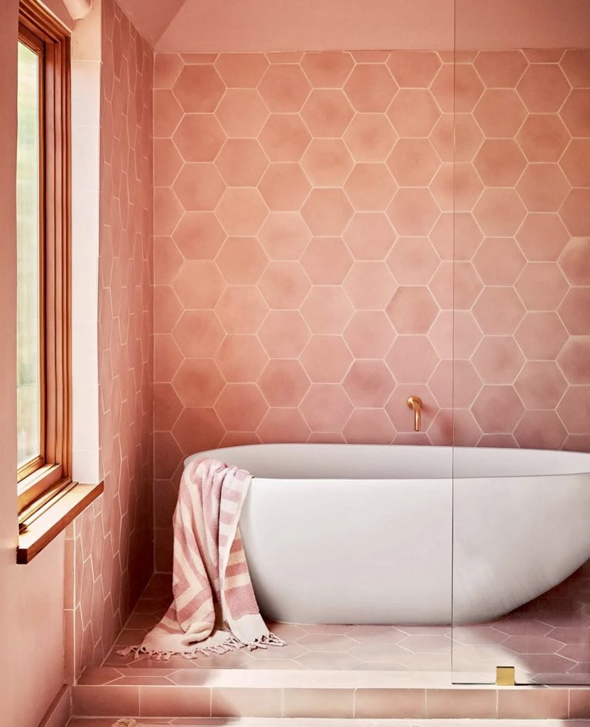 Large hexagon-shaped tiles in muted pink create a striking feature wall around the bathtub, blending playful charm with architectural precision. Natural light and gold fixtures add warmth and sophistication, proving that clever tile choices can transform small bathrooms into memorable spaces without overwhelming decor.