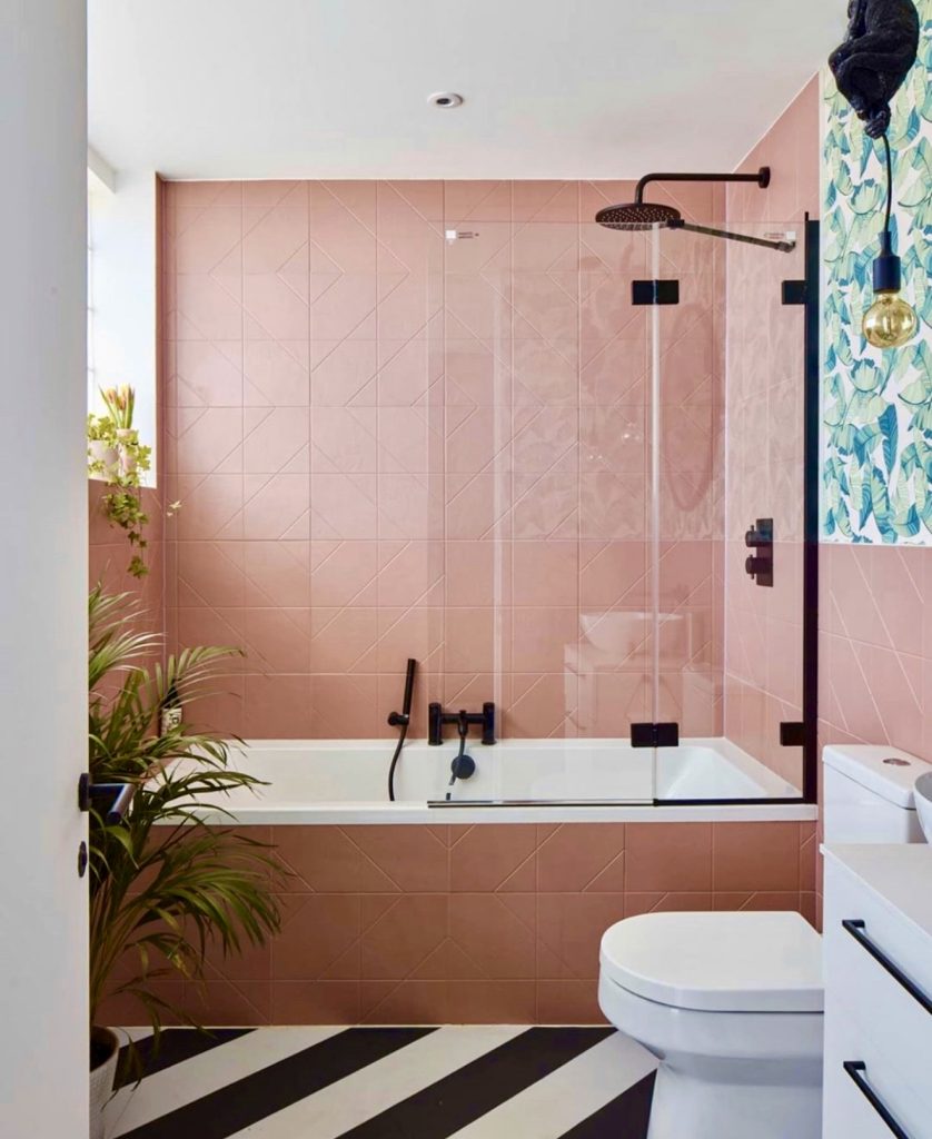Muted rose tiles paired with matte black fixtures and a bold striped floor create a bathroom that’s both edgy and inviting. The addition of greenery softens the contrast, demonstrating how daring color combinations can still feel balanced and welcoming. This design is perfect for those wanting a confident, stylish statement in their bathroom.