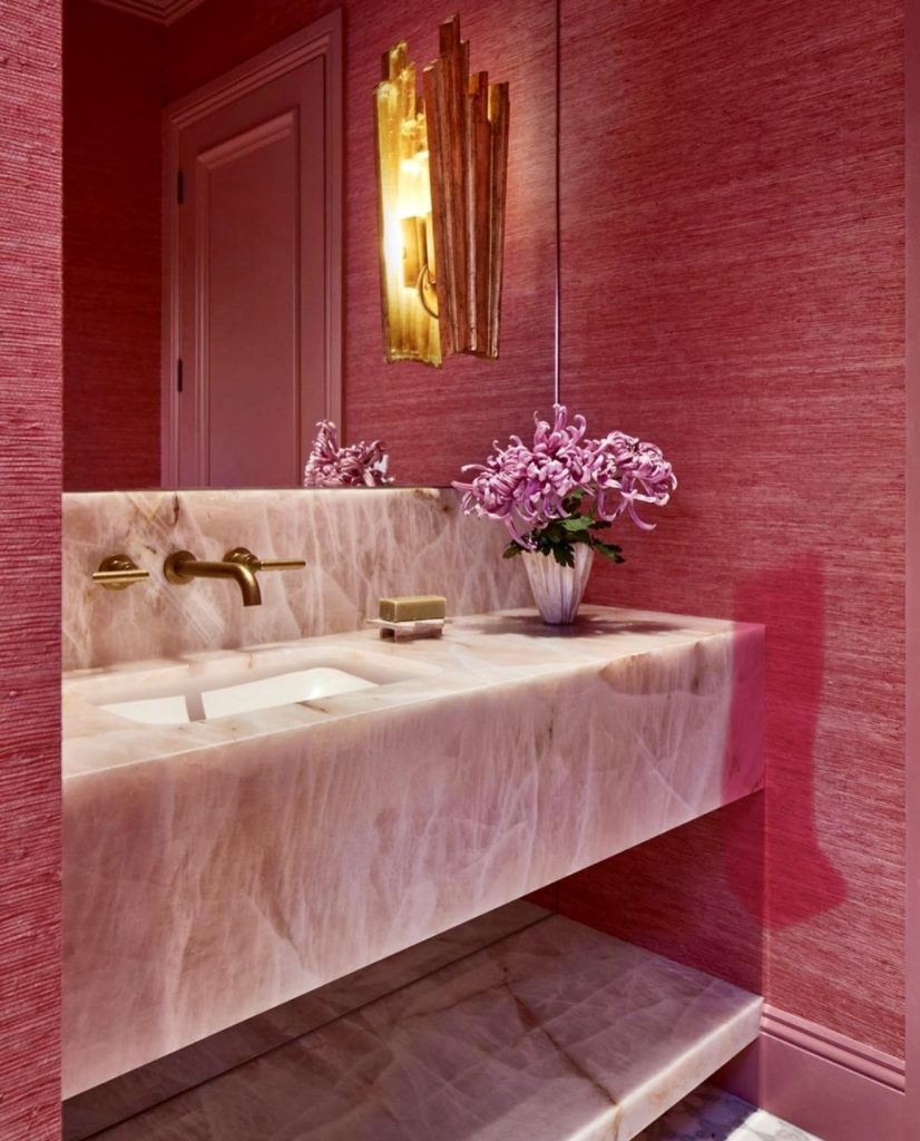 Deep pink textured walls paired with a luxurious marble vanity create a dramatic, high-end powder room. Golden lighting enhances the rich tones, while curated accessories like fresh flowers and sculptural lamps add personality. This design proves pink can be bold and commanding, perfect for urban apartments or statement powder rooms.