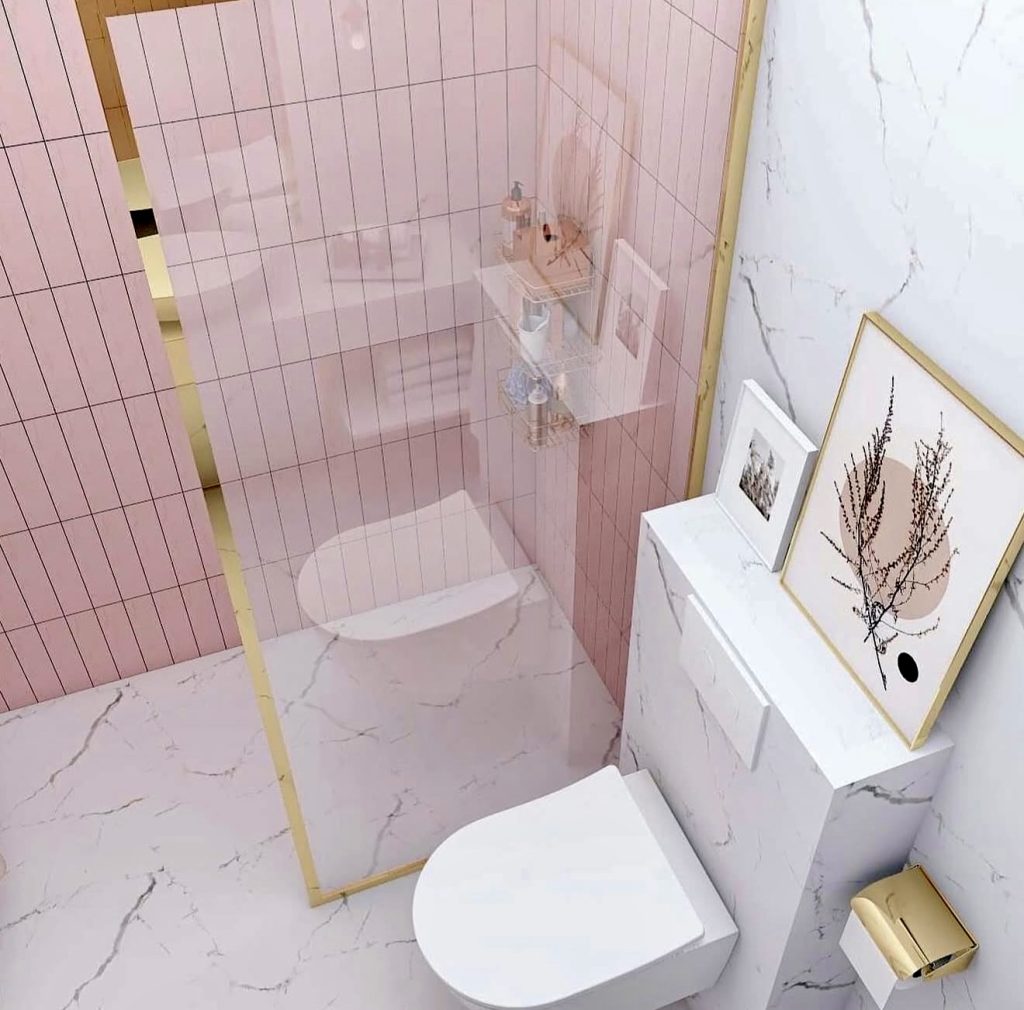 Even small bathrooms can embrace the pink trend with slim vertical blush tiles paired with white and marble finishes. Gold accents add warmth, while framed artwork introduces personality without clutter. This design demonstrates how thoughtful color and decor choices can transform limited spaces into chic, inviting powder rooms. Slim storage solutions would complement this setup perfectly.