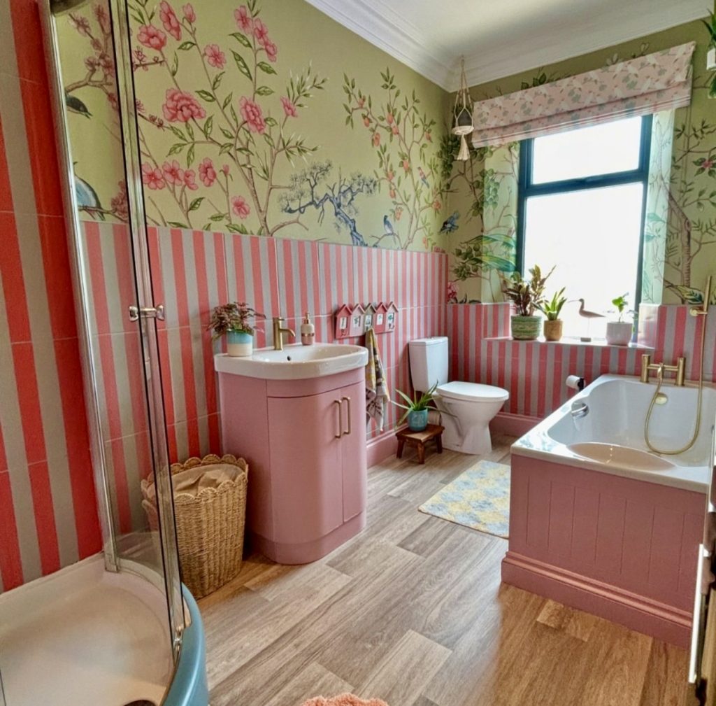 Combining striped pink paneling with floral green and pink wallpaper, this bathroom exudes playful charm reminiscent of an English garden. The pink tub and cabinetry unify the palette, while vibrant plants enhance the natural feel. This design is perfect for those who love bold, colorful spaces that reflect personality and joy.