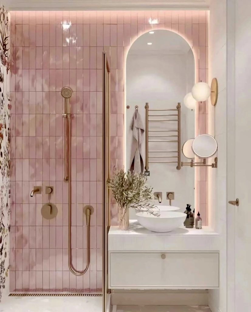 Glossy vertical pink tiles with subtle backlighting create a glowing feature wall, complemented by brass fixtures and a clean white vanity. The floral accent panel adds character without overwhelming the space. This design is ideal for homeowners seeking a warm, aesthetic bathroom that’s easy to maintain and timeless in appeal.
