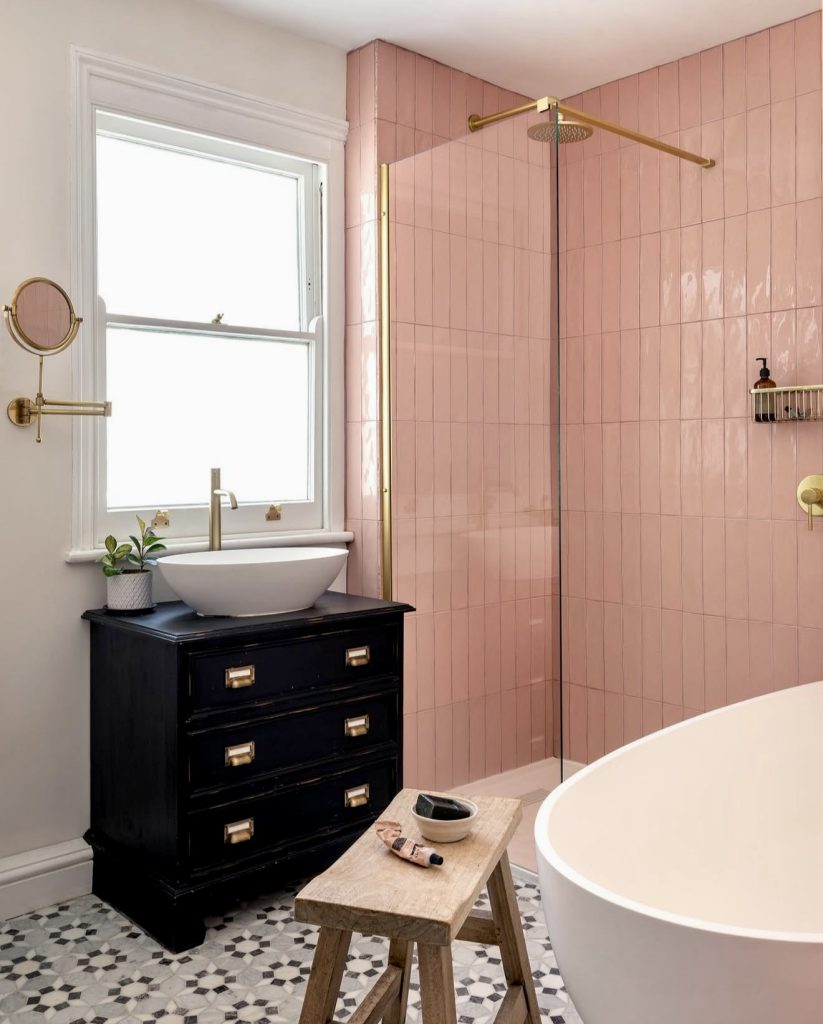 Blush vertical tiles frame a walk-in shower, while a repurposed black chest serves as a dramatic vanity topped with a vessel sink. Brass accents and patterned flooring add vintage flair, creating a space that’s both contemporary and steeped in character. This design suits those who appreciate mixing soft hues with striking contrasts.