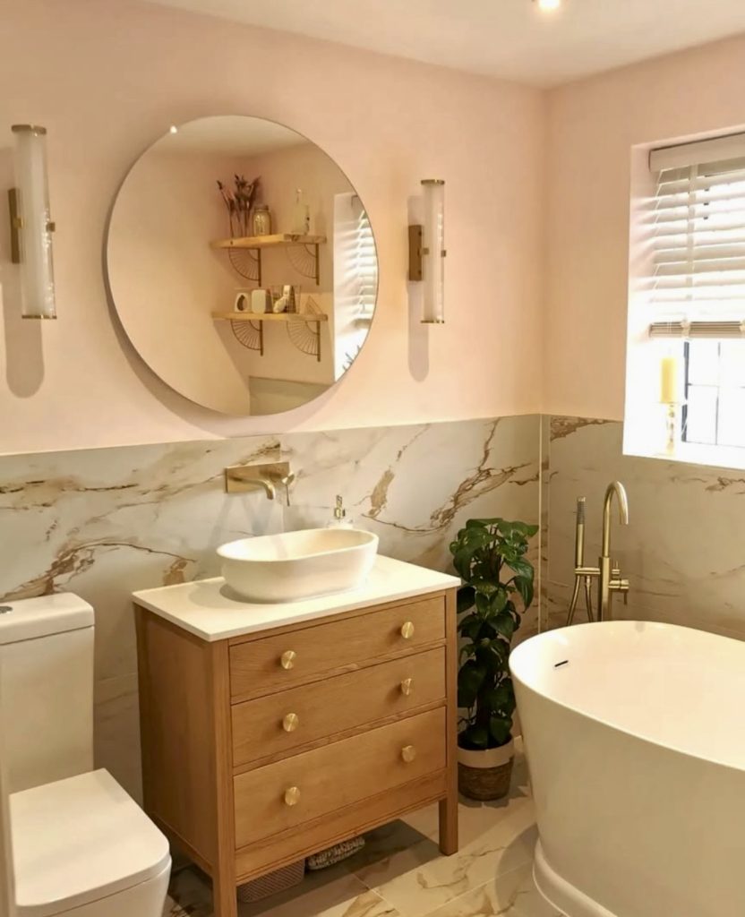 Soft pink walls balanced with marble-effect lower tiles and a wooden vanity chest create a cozy yet refined atmosphere. Gold fixtures add subtle elegance, while greenery and open shelving provide practical decor. This design is perfect for suburban homes seeking a calm, inviting retreat without overwhelming color.
