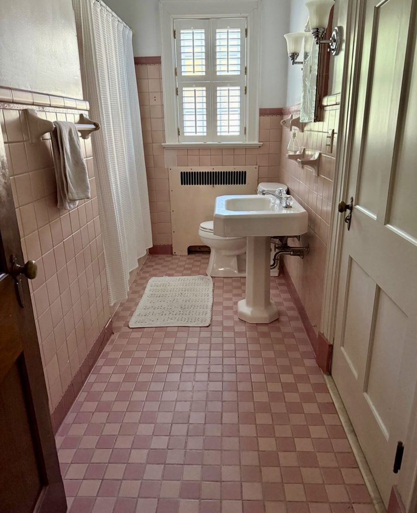 Evoking mid-century American style, this powder room features muted rose square tiles on floors and walls, paired with classic white fixtures. The vintage vibe is balanced with modern touches like patterned textiles and updated lighting, making it a nostalgic yet fresh space for fans of retro design.