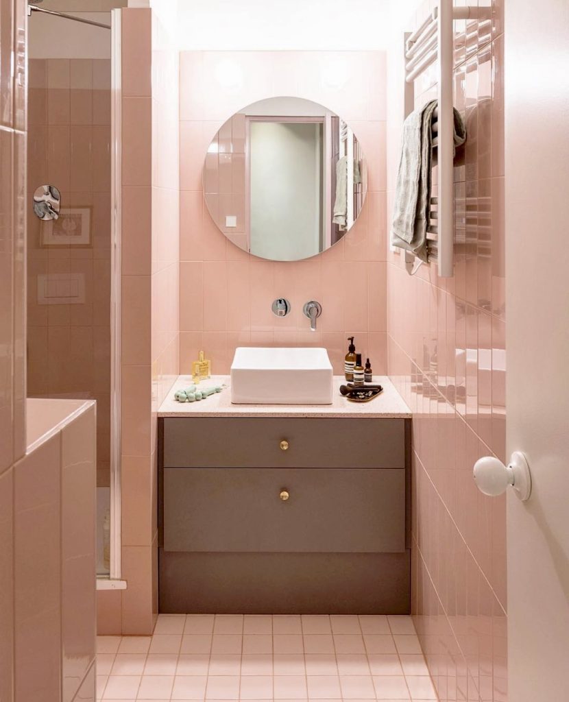 Glossy blush tiles, a round mirror, and a sleek floating vanity with brass handles create a minimalist yet elegant bathroom. The square basin adds a sharp contrast to the soft palette, making this design ideal for small spaces seeking serenity and style. Subtle lighting and pastel accessories enhance the inviting atmosphere.