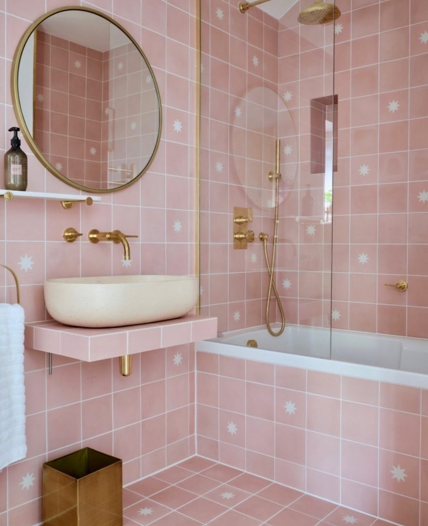 Star-patterned tiles on a rosy background add a playful touch to this bathroom. Brass details and a round mirror enhance the whimsical vibe, making it a charming and practical space. This design proves pink bathrooms can be joyful and surprising, balancing soft hues with bold patterns.