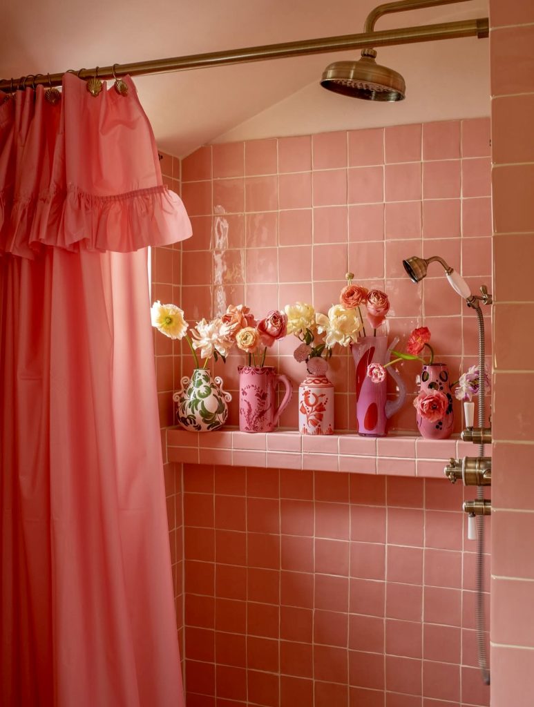Glossy warm pink tiles set a romantic retro tone, enhanced by ruffled shower curtains and fresh flower arrangements. This modern take on vintage boudoir style is perfect for those who view their bathroom as a cozy, self-care sanctuary. Adding plush textiles or patterned wallpaper can amplify the inviting atmosphere.