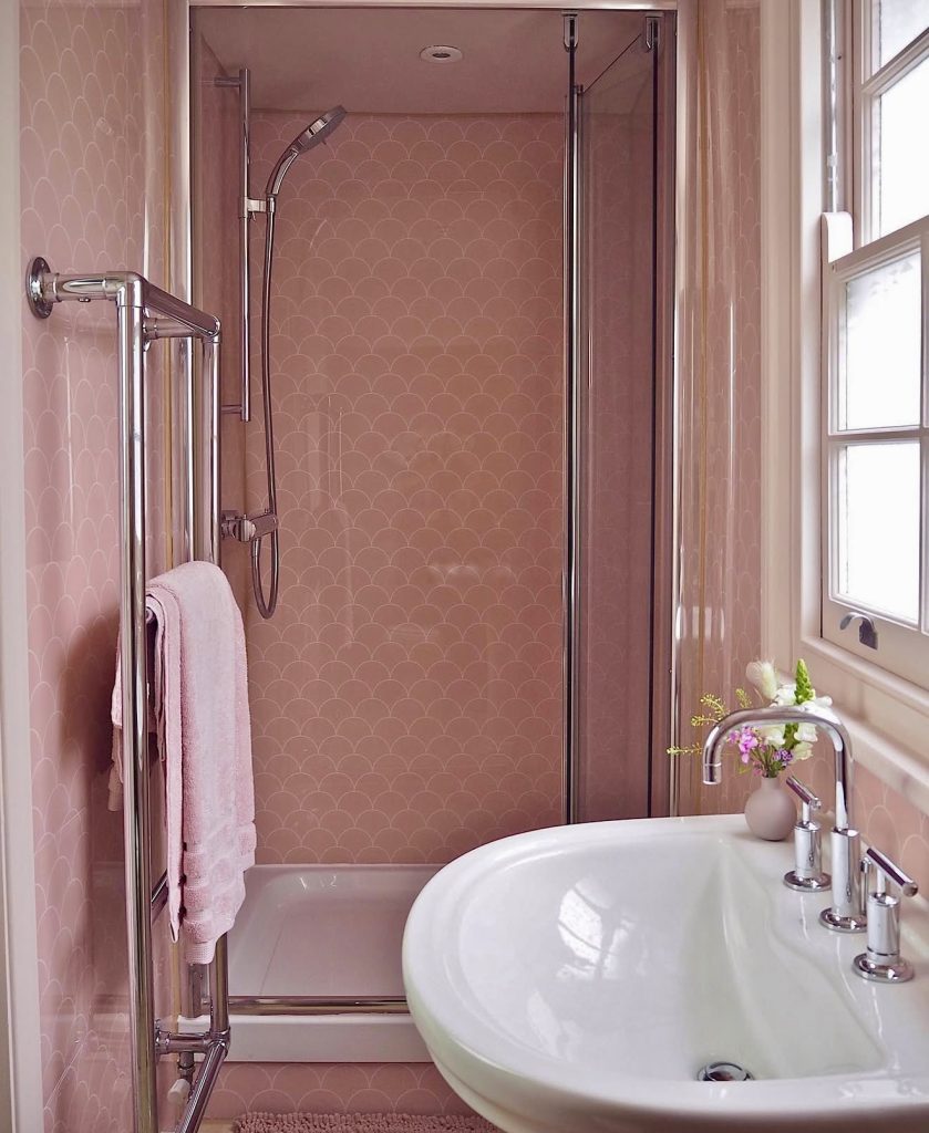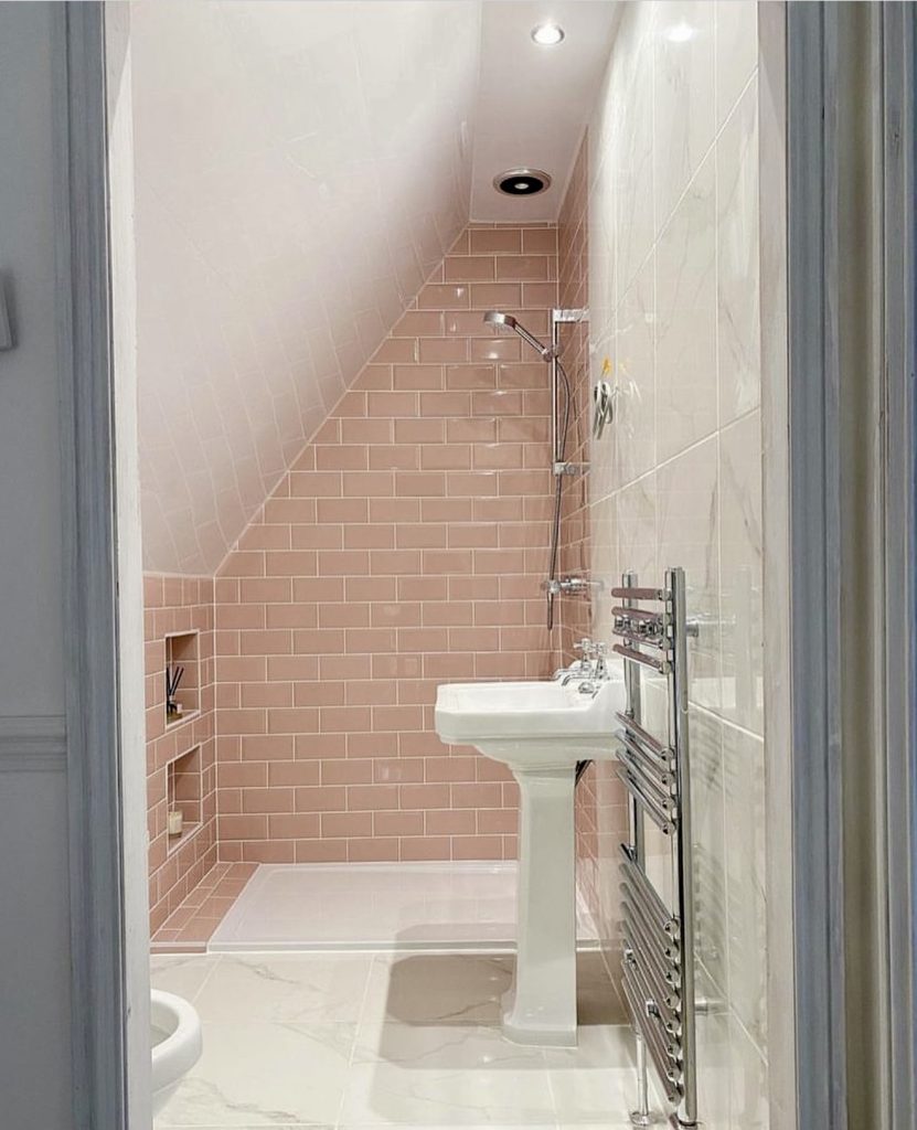 Light pink subway tiles make the most of angled attic walls, creating an intimate yet airy shower space. A pedestal sink and chrome fixtures keep the design practical, while marble-effect finishes tie the look together. This bathroom exemplifies how pink can transform challenging layouts into warm, welcoming retreats.