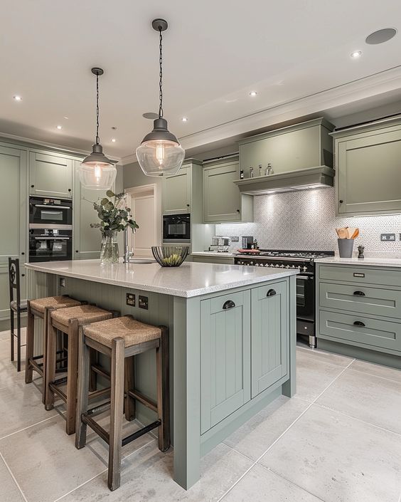 - In larger kitchens, you can experiment with bolder colors like navy blue, emerald green, or charcoal grey to make a statement.