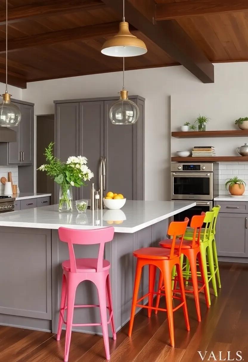 When selecting colorful seating for your kitchen island, consider the overall aesthetic of your space. If you have a modern kitchen with sleek stainless steel appliances, you may opt for chairs in a bold primary color to make a statement. On the other hand, if you have a farmhouse-style kitchen with rustic wood finishes, you might choose pastel colored stools to add a touch of whimsy. Mixing and matching different colors and styles can create a dynamic and eclectic look that reflects your personal taste.