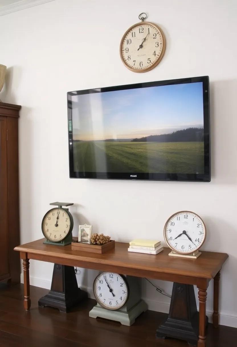 A country house style hanging clock goes perfectly with a country house style TV stand made of natural wood. The clock not only serves a practical purpose, but also gives the interior a classic, rustic touch.