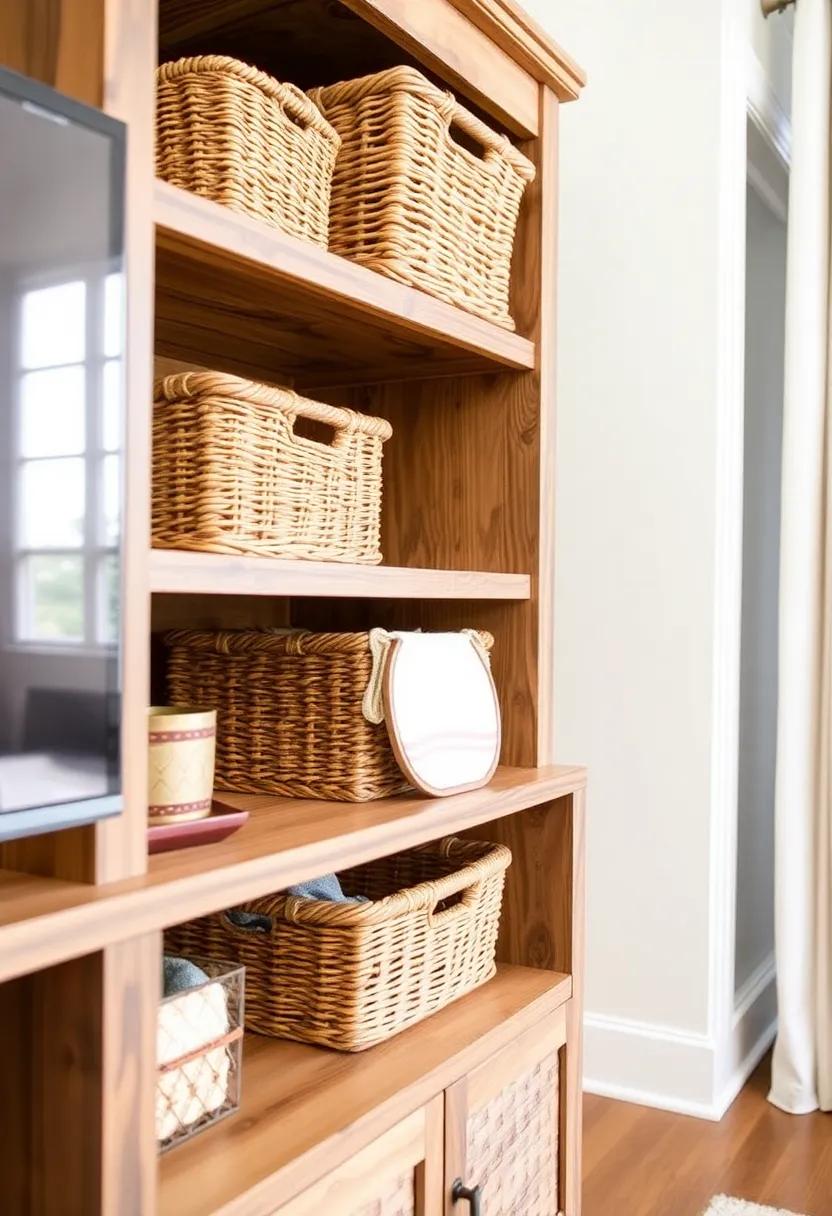 Woven wicker baskets fit elegantly on the shelves of a rustic TV stand, combining decor and organization. The natural texture of the baskets complements the wood and offers a practical yet charming storage solution.